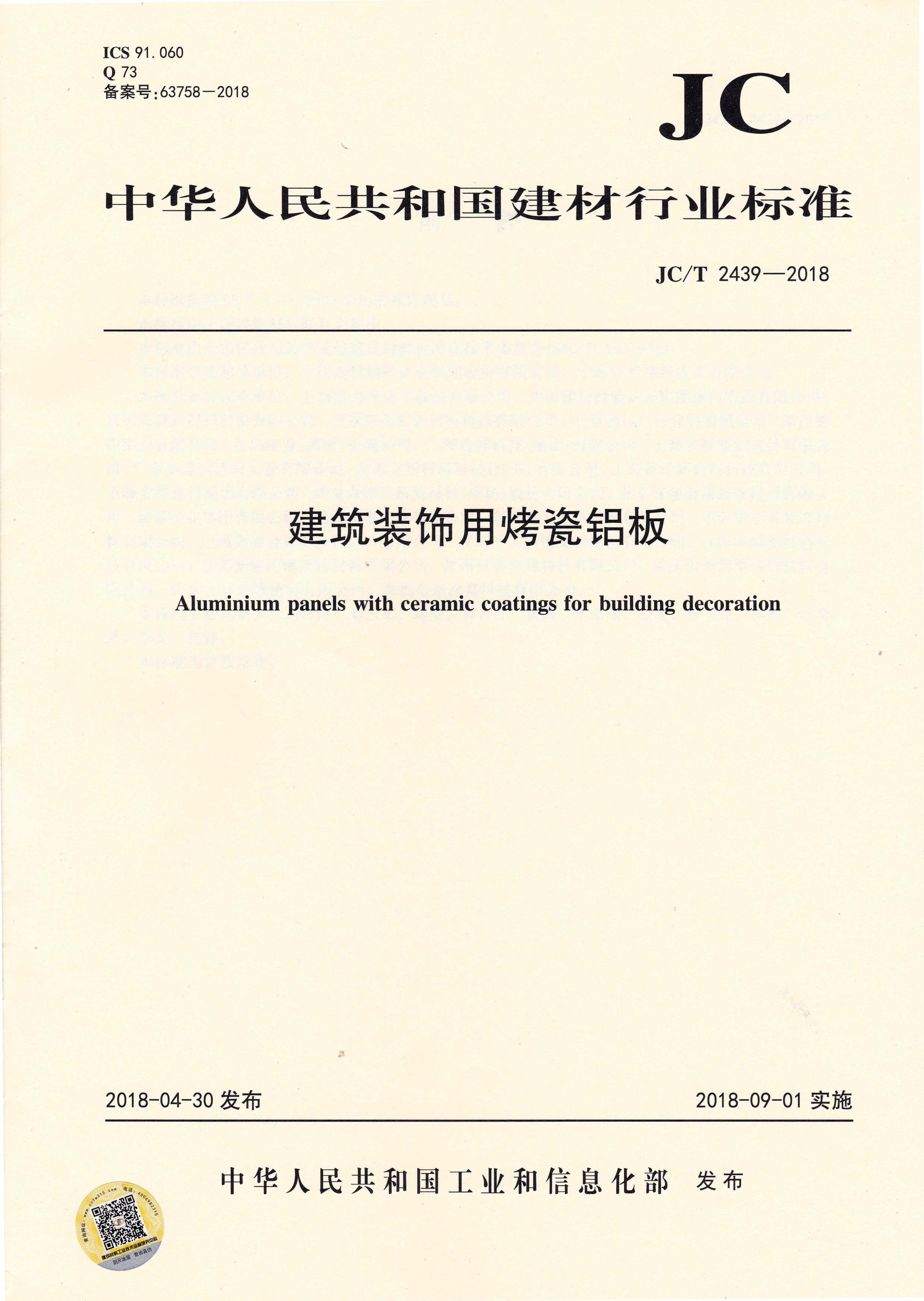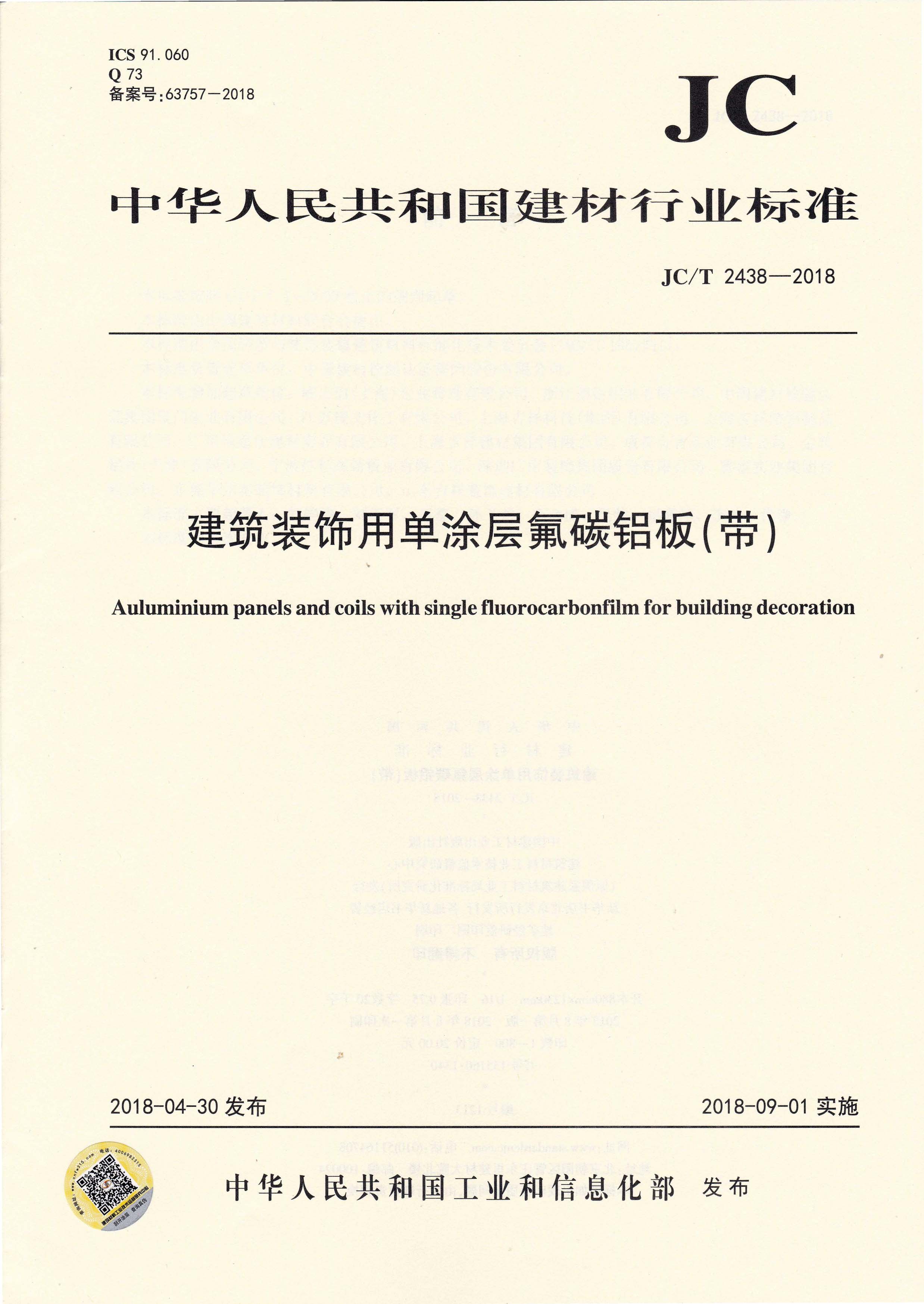 近日,由中國建筑材料聯(lián)合會提出,雅泰實(shí)業(yè)集團(tuán)有限公司參與起草的JC/T 2439-2018《建筑裝飾用烤瓷鋁板》、JC/T 2438-2018《建筑裝飾用單涂層氟碳鋁板(帶)》兩項(xiàng)行業(yè)標(biāo)準(zhǔn)于2018年4月30日首次發(fā)布,2018年9月1日起正式實(shí)施。