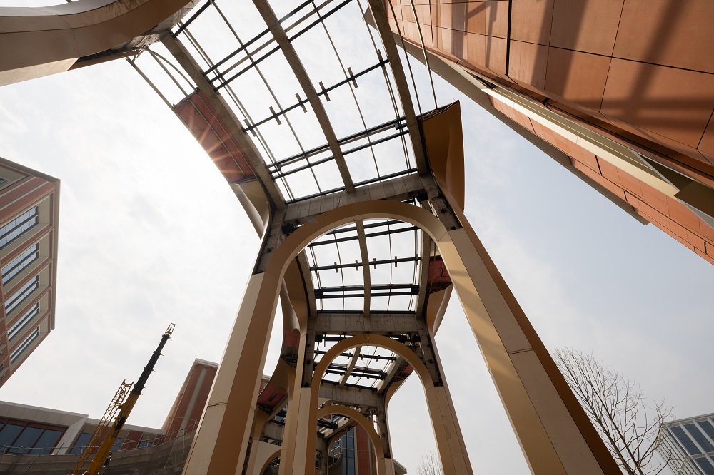 以組團內一座優(yōu)雅大氣的外部環(huán)廓為例:典雅高聳的金色立柱結合金屬光澤的大弧度金色鋁板,毫無罅隙的相互拼接,打造低奢又不失浪漫的小憩之所。無論是在陽光的照耀下的金色光澤,還是在月色的映襯中清幽弧線,幕墻裝飾的穹頂都能展現(xiàn)出獨特的質感和光澤,為整個研發(fā)中心增添了一份神秘而迷人的魅力。