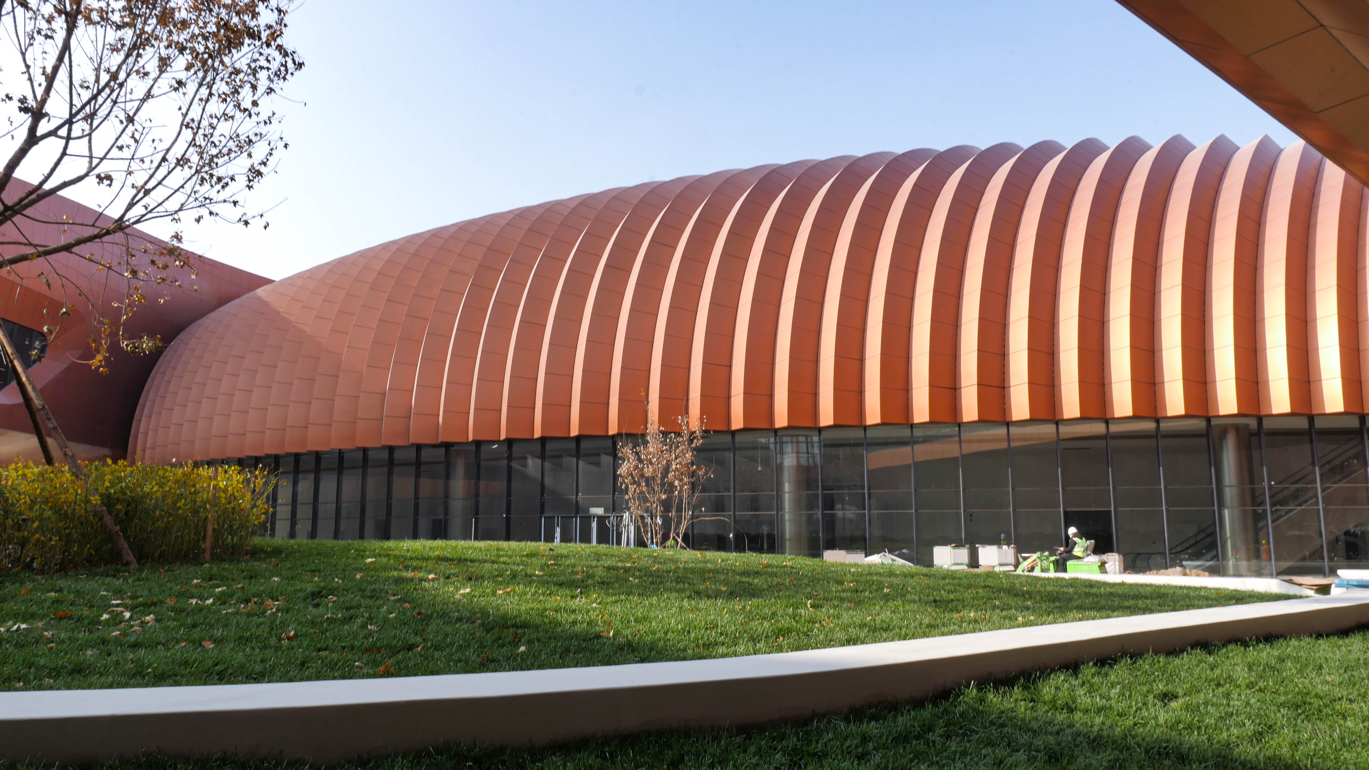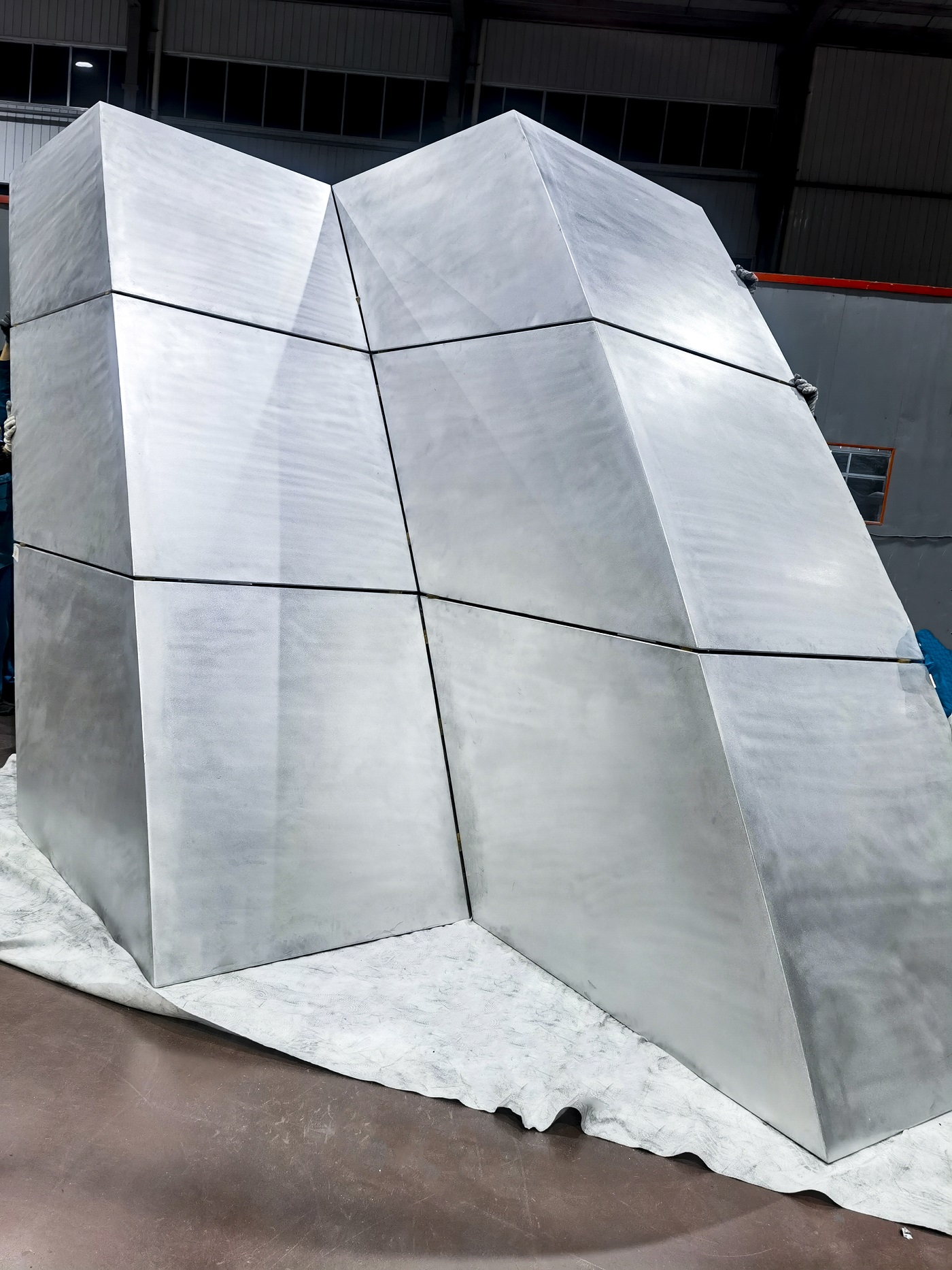 北京新國展“紫金絲帶”褶皺板,每件板上下、左右角度都有區(qū)別變化,左右呈發(fā)散式布局安裝,上下角度變化2.5度。尺寸偏差不超±1毫米,角度偏差不超過±0.5度,每件板都需專用模標尺測量弧度。