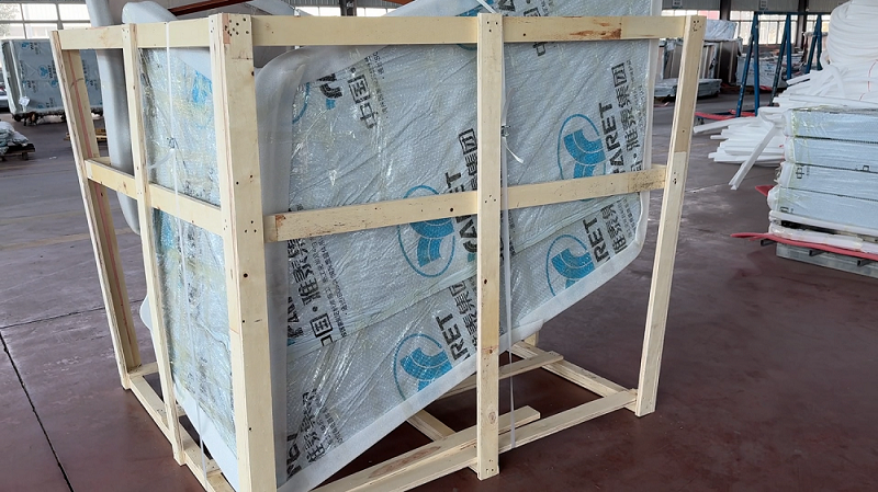 成品褶皺板經檢驗合格后,分別用保護膜,外附加一層氣泡膜進行包裝防護。裝運時釘制專用木箱進行外圍運輸防護。